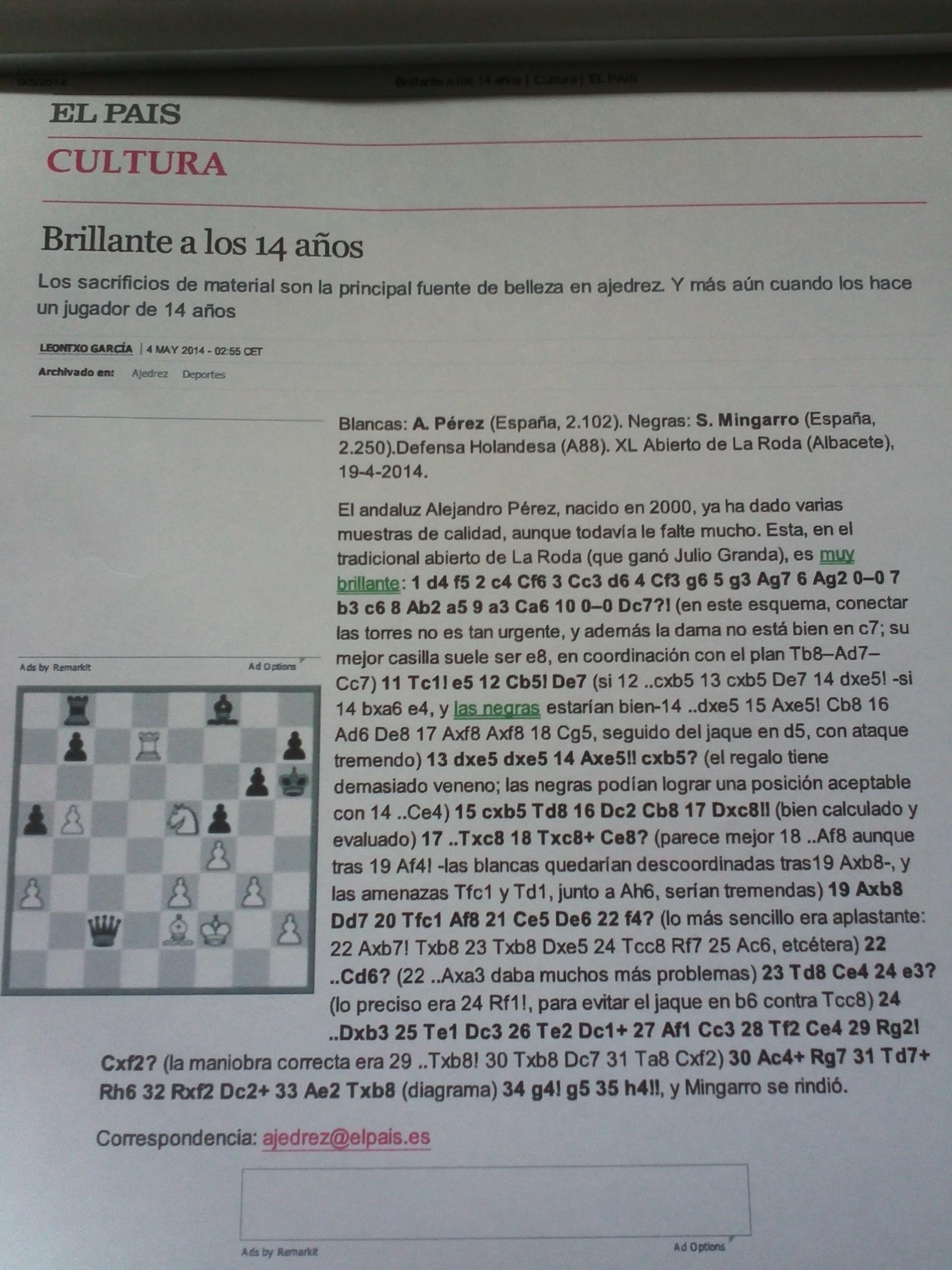 El Esteponero Alejandro Perez García consigue que una de sus brillantes partidas sean analizadas por el prestigioso Leontxo García experto en Ajedrez y periodista de El Pais.