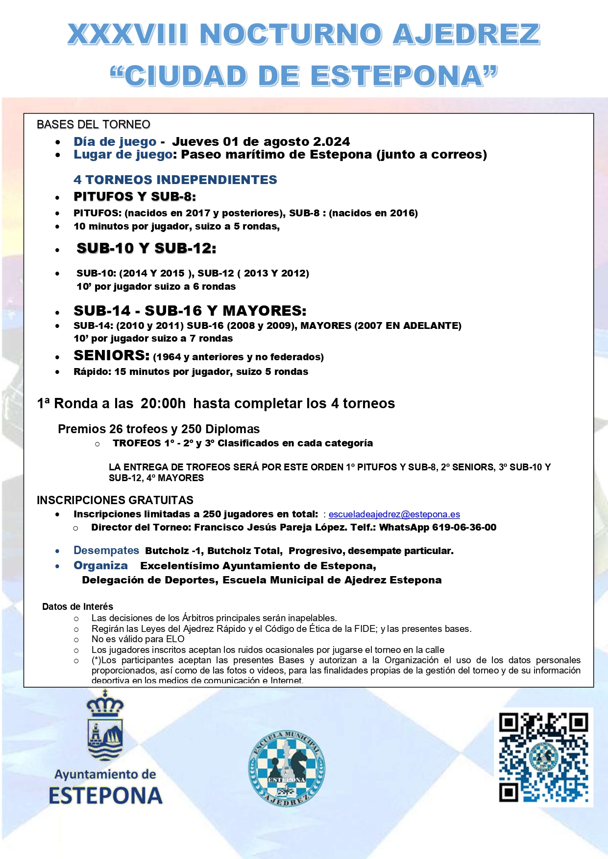 El ILMO. AYUNTAMIENTO DE ESTEPONA, Y la CONCEJALÍA DE DEPORTES DE ESTEPONA, junto a la ESCUELA MUNICIPAL DE AJEDREZ DE ESTEPONA, organizan un año más el XXXVIII NOCTURNO DE AJEDREZ “CIUDAD DE ESTEPONA”, Uno de los Eventos mas grandes de España a nivel “Aficionado” que año tras año se ha ido superando, gracias al antiguo director de la Escuela Municipal de Ajedrez de Estepona y Monitor, D. MIGUEL ABRIL RODRÍGUEZ, que realizó año tras año un “GRAN TORNEO DE AFICIONADOS” durante sus treinta y siete ediciones que asistió. El torneo se dividirá en cuatro torneos por edades. El Primero “Pitufos y Sub08”, el Segundo “Sub10 y Sub12”, el Tercero “Sub14, Sub16 y Mayores”, y un Cuarto Torneo “Seniors” en el que mayores jubilados que no estén federados podrán disfrutar de este maravilloso y espectacular juego de las “64 Casillas” que es el Ajedrez. Para inscribirse, se tendrá que rellenar cada jugador su respectivo formulario dependiendo de su edad, al cual se le confirmará tras haber examinado dicho formulario. Desde la Organización deseamos que siga creciendo dicho torneo, como lo ha hecho año tras año, dicho evento estará limitado a 250 jugadores divididos en distintos torneos. ¡¡¡GRACIAS A TODOS Y TODAS!!!