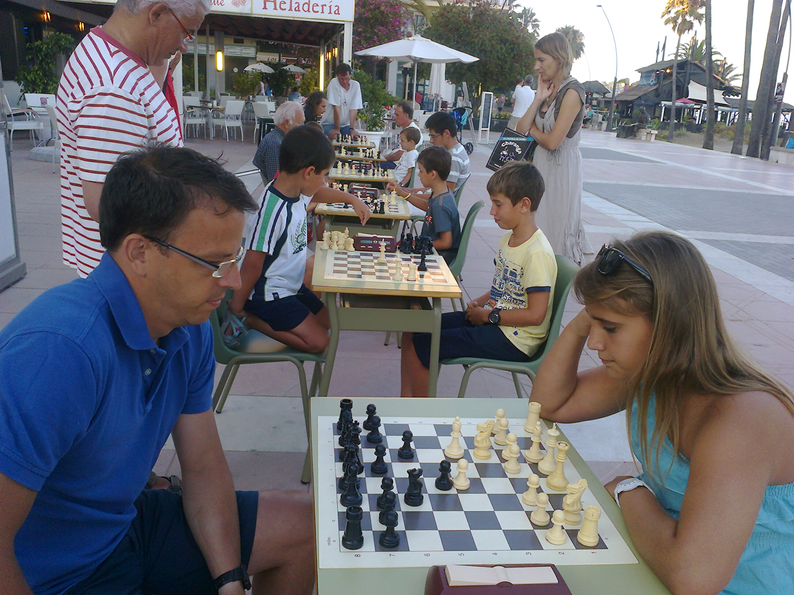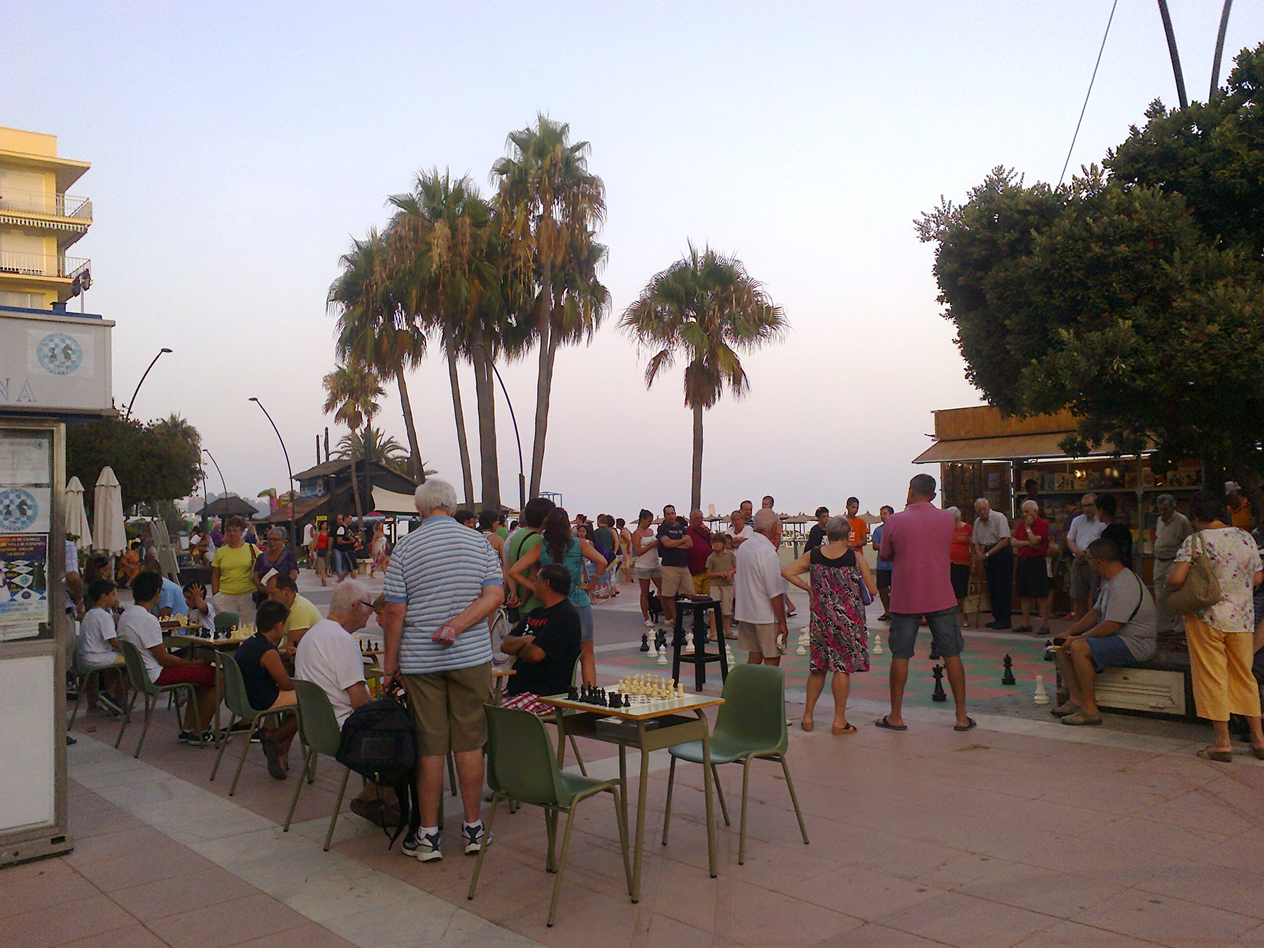 En el paseo maritimo de Estepona julio y agosto de lunes a jueves de 19’00h. a 22’00h. podran jugar ajedrez todos los que lo deseen gratis, competiciones, simultaneas etc..